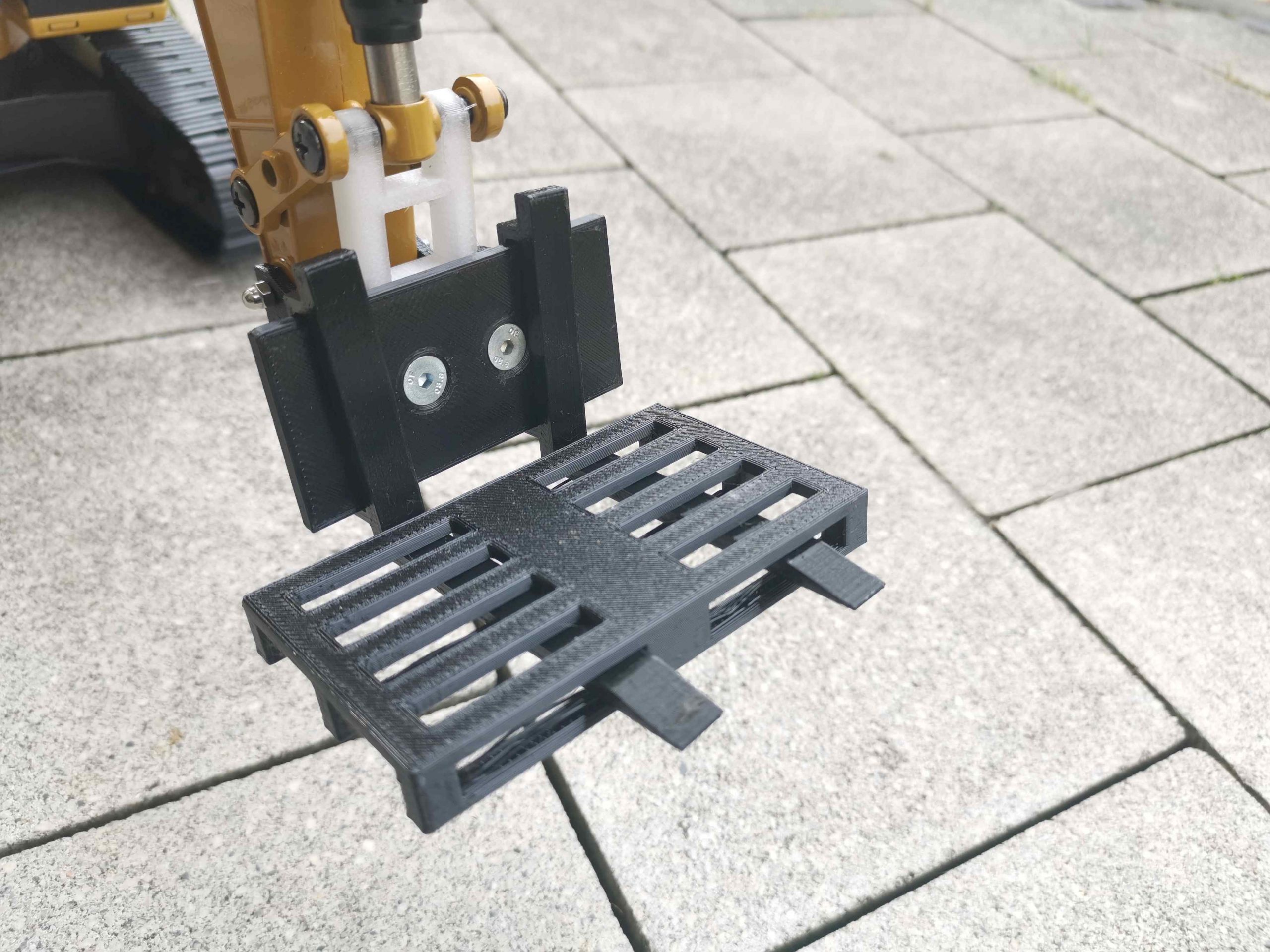 Zum Verkauf steht eine Palettengabel inkl. 1x Palette für den Huina 580 Kettenbagger aus PETG gefertigt.